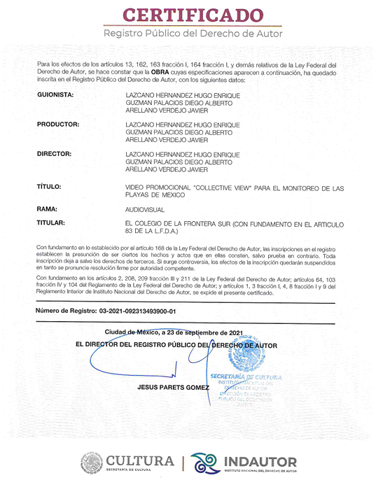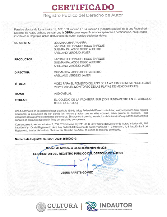 Certificado de contenido audiovisual utilizado en el proyecto de Collective View. Como lo son imágenes y videos.