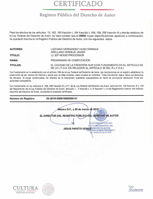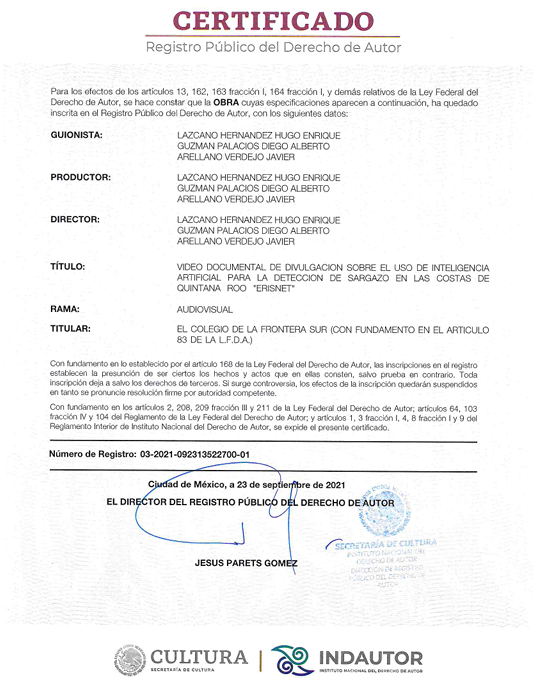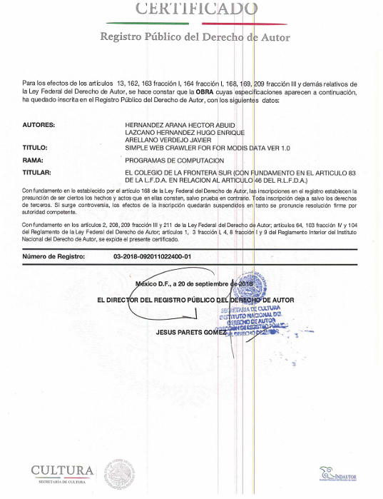 Por esta razón, hemos registrado ante INDAUTOR productos de nuestra autoría, desarrollados a lo largo del proyecto, en los rubros de software, bases de datos y obras audiovisuales.